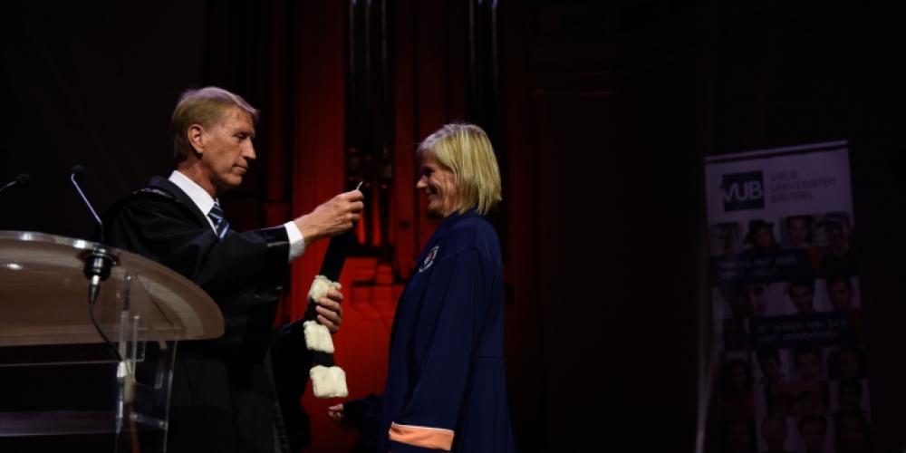 De academische zitting begon om 15 uur, maar een van de hoogtepunten volgde een goed uur later: de overhandiging van de epitoga aan Caroline Pauwels door Paul De Knop. Daarmee was de overdracht van de bevoegdheden als rector van laatstgenoemde aan Pauwels officieel. Het emotionele moment werd gevolgd door een lang en warm applaus waarmee de verzamelde VUB-gemeenschap haar dankbaarheid betuigde voor het vele werk waarmee Paul De Knop – zoals Caroline Pauwels het wat later zou zeggen – “de VUB tot ongekende hoogtes heeft gebracht.”