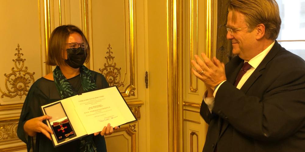 Op 2 september nam VUB-professor Ine Van linthout de onderscheiding ‘Bundesverdienstkreuz am Bande’ in ontvangst in de Duitse Ambassade in Brussel. De oorkonde werd al in oktober 2020 ondertekend, maar de uitreiking werd omwille van corona uitgesteld. Professor Van Linthout is docent Duits aan de afdeling Toegepaste Taalkunde van de VUB en directeur van dasKULTURforum Antwerpen en onderzoekt de vertaling van Vlaamse literatuur in het Duits tijdens het naziregime.