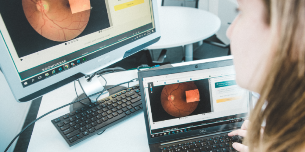 Het netvlies kan in beeld gebracht worden met een eenvoudige digitale foto. Een computerprogramma dat snel en eenvoudig foto’s van het oognetvlies kan analyseren is heel nuttig voor het opsporen van diabetische retinopathie. Een computerprogramma kan dat niet uit zichzelf. Dat moet leren wat goed en wat fout is. Daarom lanceerden het Vlaams Instituut voor Technologisch Onderzoek (VITO), de Diabetes Liga en de Vrije Universiteit Brussel (VUB) begin 2019 het online burgerwetenschapsproject ‘Oog voor Diabetes’. Burgers worden aangemoedigd om op een online platform foto’s van het oognetvlies te ‘annoteren’, probleemgebieden in die foto’s aan te duiden. Op die manier is het mogelijk om een computerprogramma verder te ontwikkelen om de symptomen van diabetische retinopathie te leren herkennen.