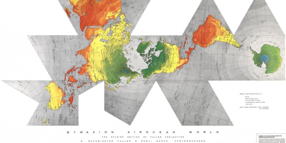 De DYMAXION MAP OF THE WORLD werd ontworpen door de geniale Amerikaanse uitvinder Richard Buckminster Fuller. Alle delen van de wereld worden op deze kaart gelijk behandeld. De kleuren illustreren enkel de verschillen in temperatuur. Richard Buckminster Fuller heeft de driedimensionale aarde verdeeld in twintig gelijkbenige driehoeken en deze uitgevouwen tot een tweedimensionaal model met als centrum de Noordpool.